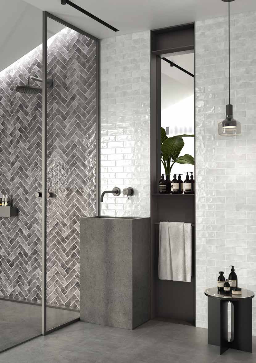 Schmale, rechteckige Fliesen, die sich als Band durch den oberen Bereich einer verfliesten Wand ziehen. Gut geeignet, um verschiedene Fliesenarten zu kombinieren. Bordüren am Boden verändern die Perspektiven in einem Raum und unterstreichen seinen Charakter.